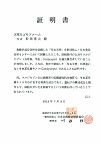 日本食品分析センターにおいて試験を依頼、コルジセピンを適正量含有していることが判明しています。 これは、冬虫天草が正真正銘の冬虫夏草であることを証明をしています。